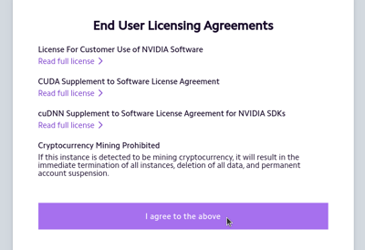 6. Review the license agreements and terms of service. If you agree to them, click I agree to the above to launch your instance.