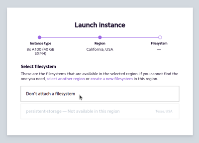 If you don’t want to or can’t attach a persistent storage file system to your instance, click Don’t attach a filesystem.