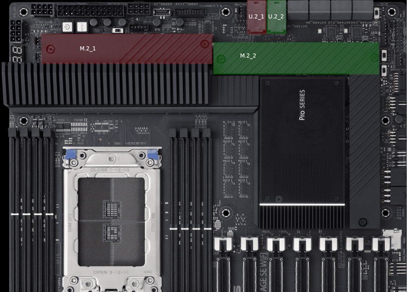 If you have 1x M.2 NVMe drive and 1x U.2 NVMe drive in your workstation, move the M.2 NVMe drive from slot M.2_1 to slot M.2_2. Move the U.2 NVMe drive from slot U.2_1 to slot U.2_2.