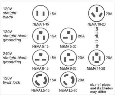 For customers in North America, the SF-2000F14HP 2000W PSU power cord uses NEMA 6-20 or NEMA 6-15 connectors, which look like the ones in the third row in the picture, below.